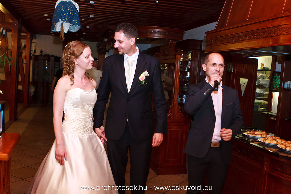 Már délelőtt megérkeztünk az étterembe, hogy összeszereljük DJ technikánkat. Mire a templomból visszaértünk már minden készen állt az estéhez. A vacsorát Fruzsi és Attila bevonulása nyitotta meg. Szokás szerint mint ceremóniamester köszöntöttem a friss házasokat átadtam jókívánságaimat, majd Attila szólt néhány szót vendégeikhez. Ezzel el is kezdődött a vacsora.