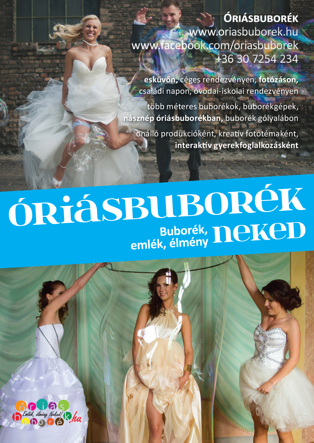 Óriásbuborék fotósarok (stúdióval és fotóssal): 75.000 Ft (háttérrendszer, vakuk, vezérlés, fényképezőgép és képkészítés, utómunka, képek átadása elektronikus formában szerverről letölthető módon) Időtartam: 4 óra